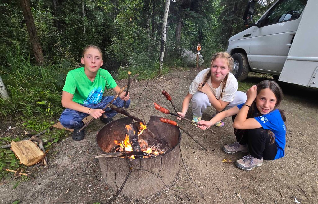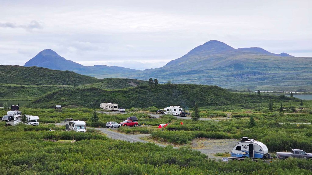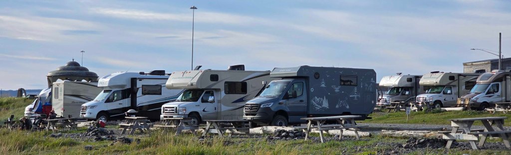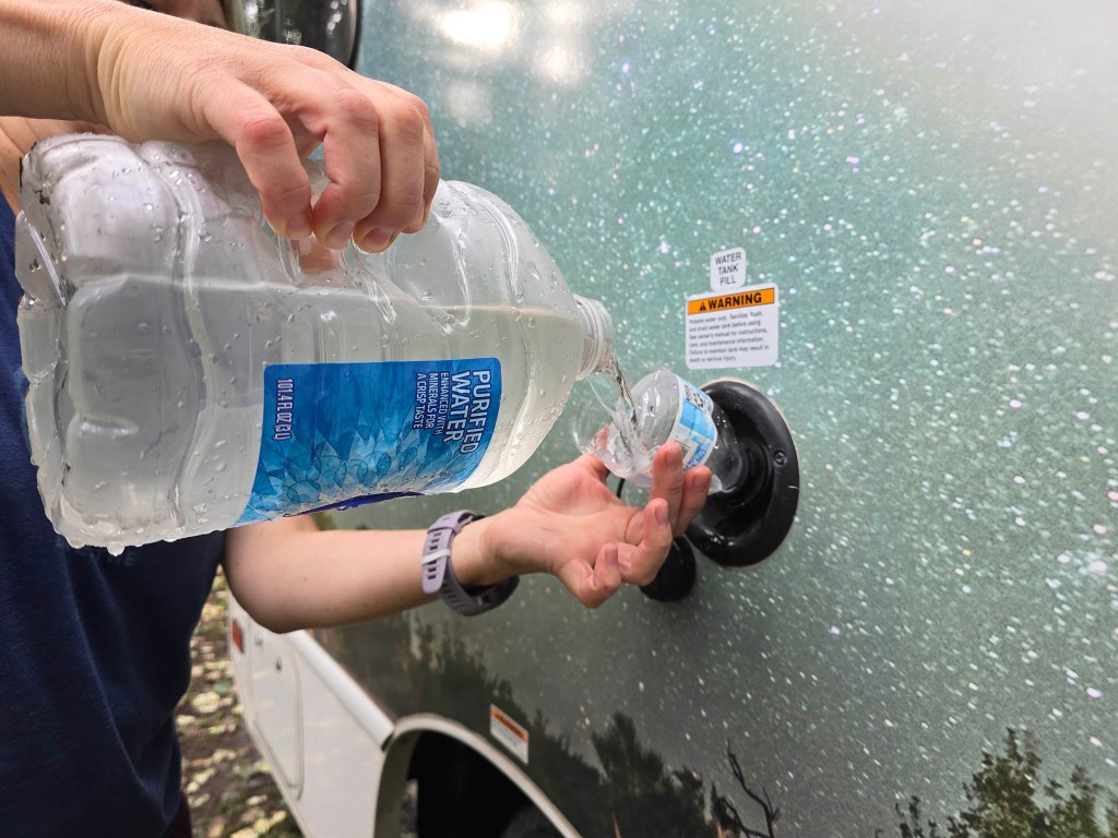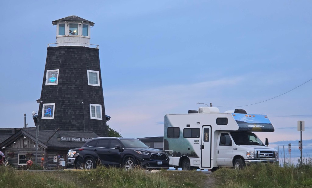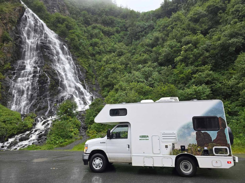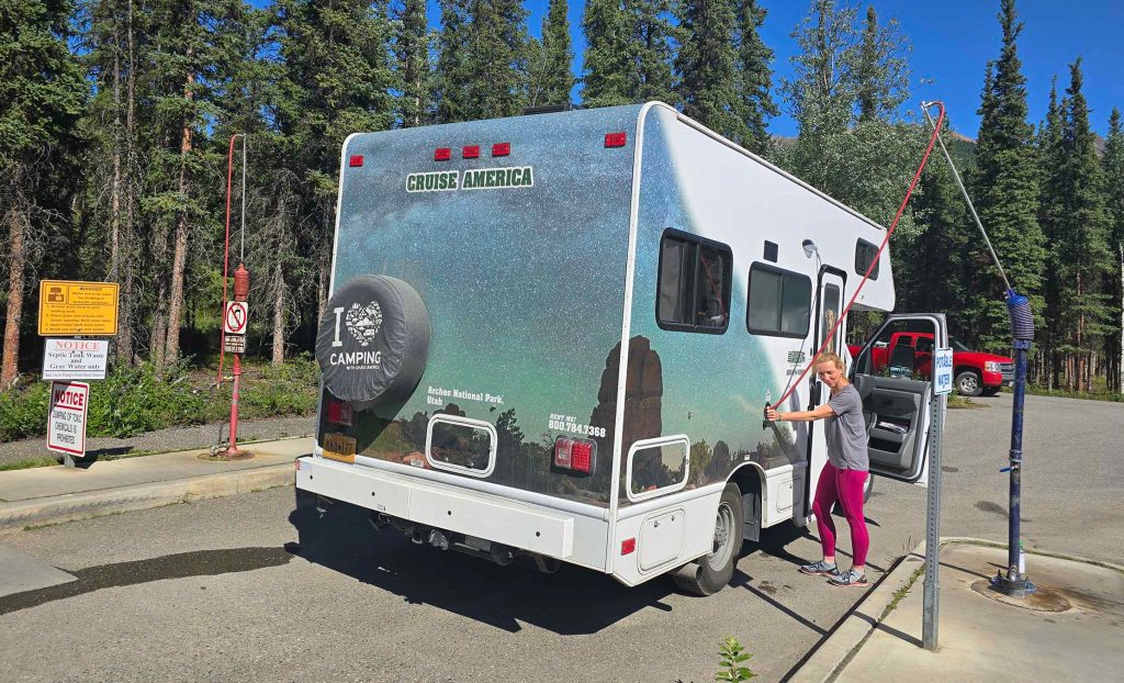 Dump station i dostęp do wody potrzebnej do napełnienia zbiornika w kamperze – Wbrew pozorom nie jest to takie łatwodostępne na Alasce. Stacje benzynowe Chevron posiadają czasami bezpłatne dump station, ale w większości przypadków trzeba zapłacić od $5 za wodę i od $15 za wylanie nieczystości. WODA: W kryzysowych sytuacjach należy wykonać lejek z jednorazowej butelki plastikowej i wlewać wodę manualnie, co też zrobiliśmy z powodu braku dostępu innej opcji – czas napełnienia zbiornika tą metodą około 10 minut przy jednoczesnym ręcznym pompowaniu wody do butelek galonowych. My korzystaliśmy tylko ze zlewu i prysznica (pojemność zbiornika na ścieki 16 gal (62 L), a więc „nasza brudna woda” z minimalną ilością mydła była w kryzysowych sytuacjach spuszczana do studzienek kanalizacyjnych lub do przydrożnych rowów. Tylko dlatego, że po prostu nie było w pobliżu miejsc, gdzie można by to było zrobić przepisowo.