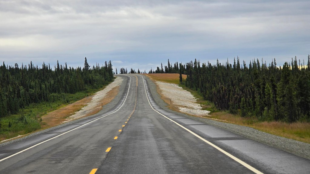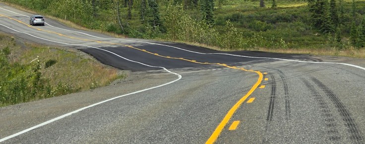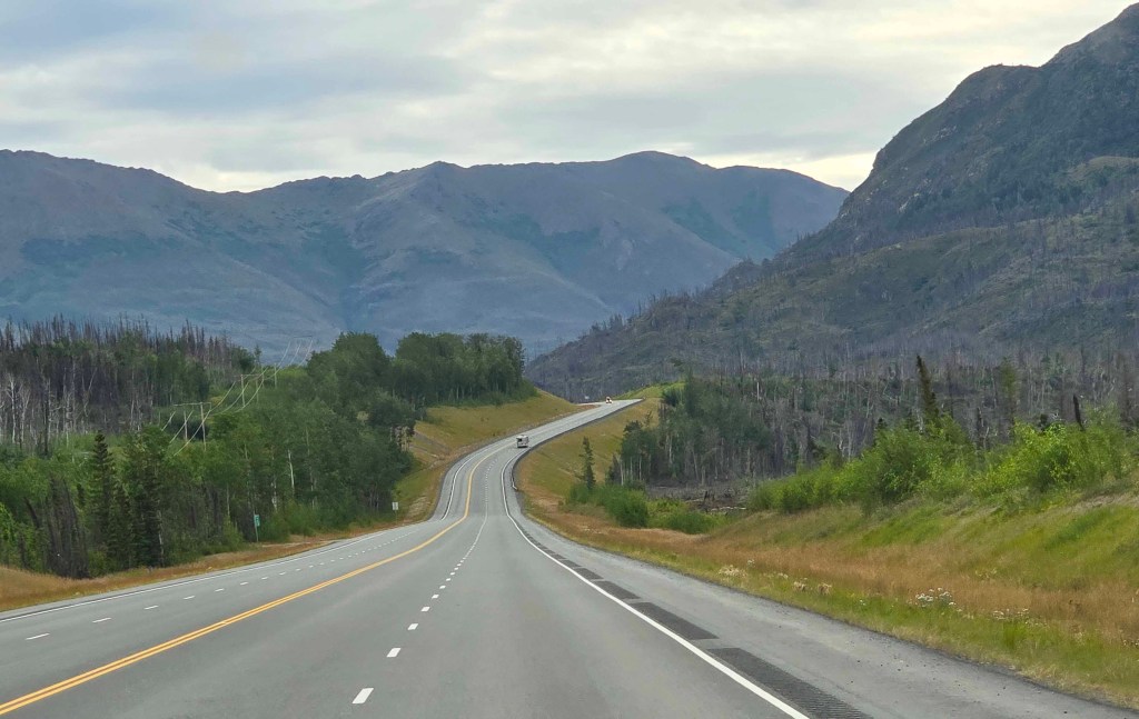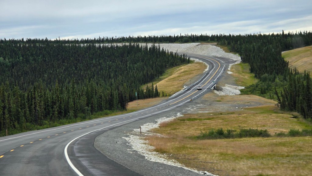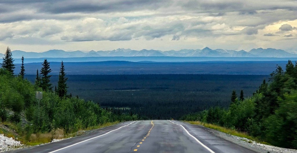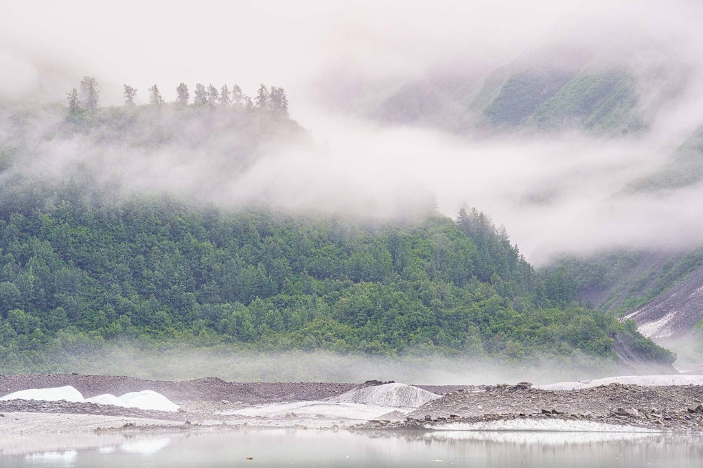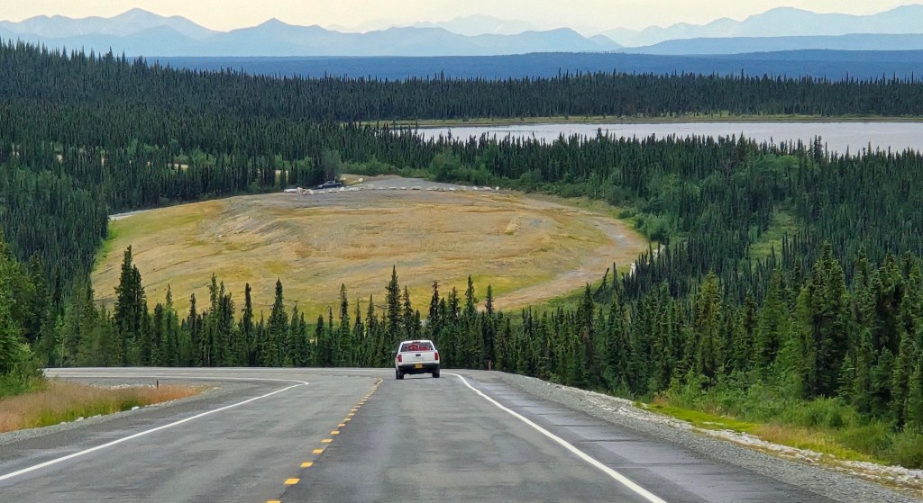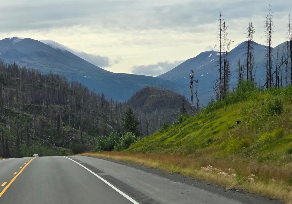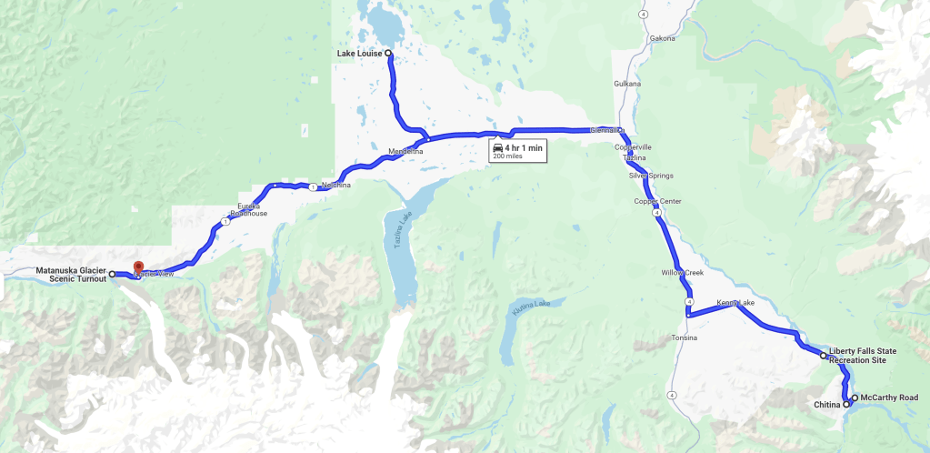 Wyruszamy o 7 rano we mgle…… na oparach benzyny… ☹ W naszych przeliczeniach nie uwzględniliśmy prawie 40 milowej trasy nad jezioro Louise i zjazdu na lodowiec Matanuska, co znacznie ukruciło nasz zasób paliwa…..