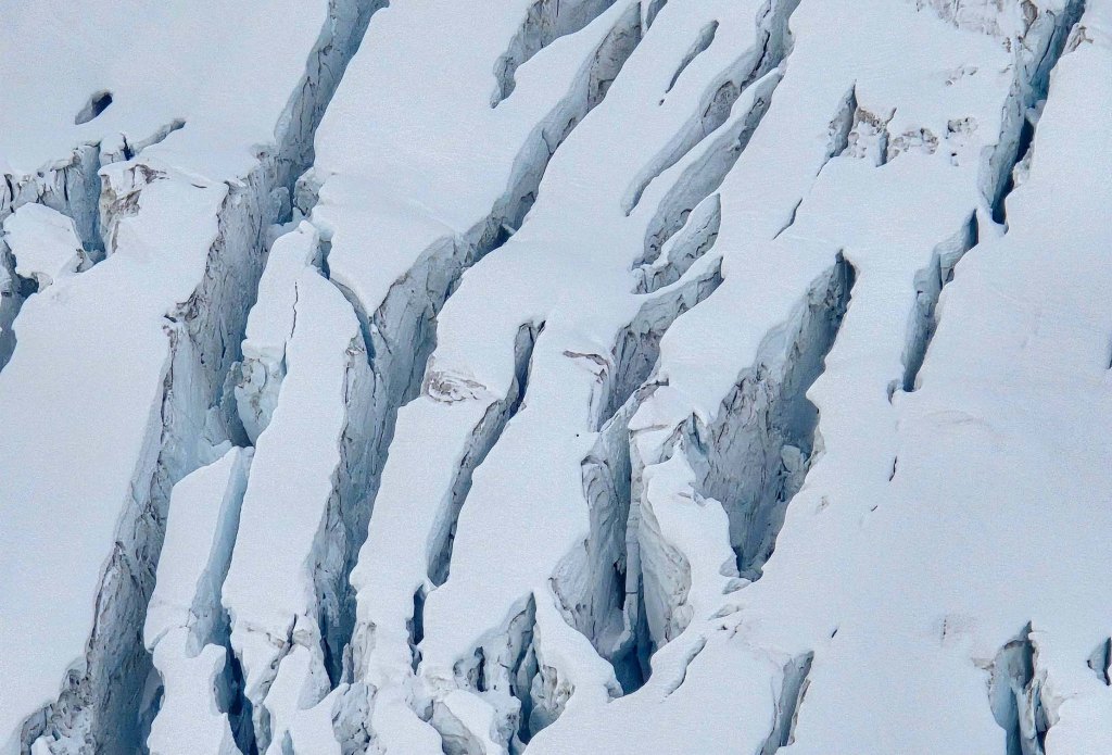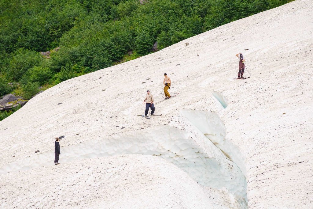 Ze śnieżnego stoku zjeżdżają na nartach lubiący jak widać ryzyko młodzi goście. Liczba i wielkość szczelin widzocznie im nie przeszkadza w uprawianiu sportu.
