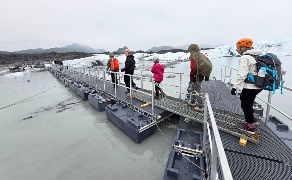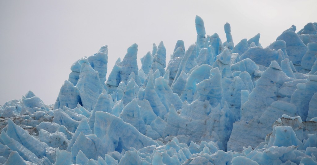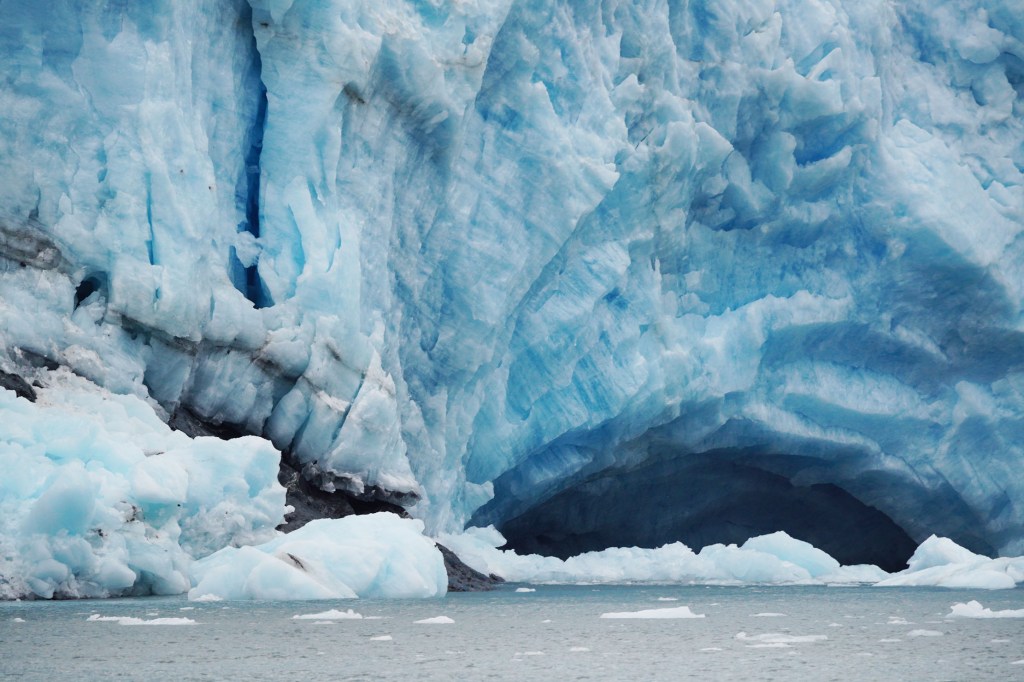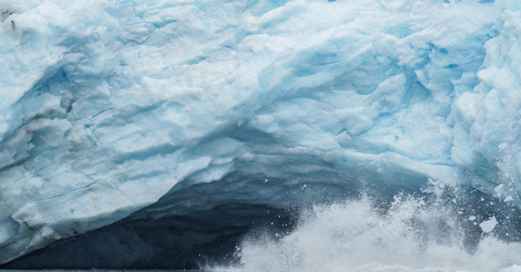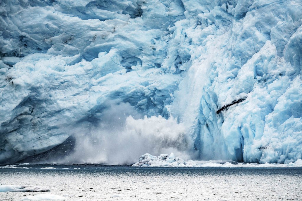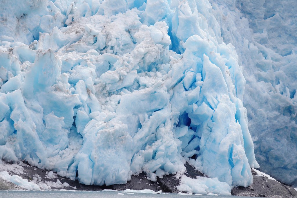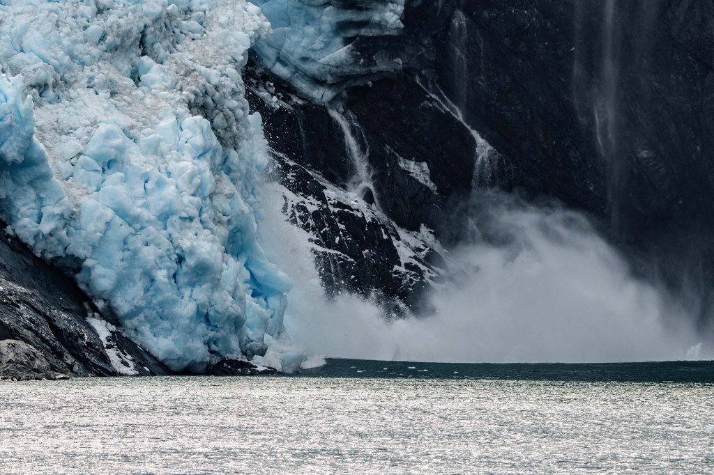 Podmywająca czoło lodowców woda, powoduje odrywanie się wielkich bloków lodowych o wysokości nawet do 60 metrów, które odrywają się i rozbijają o wodę.