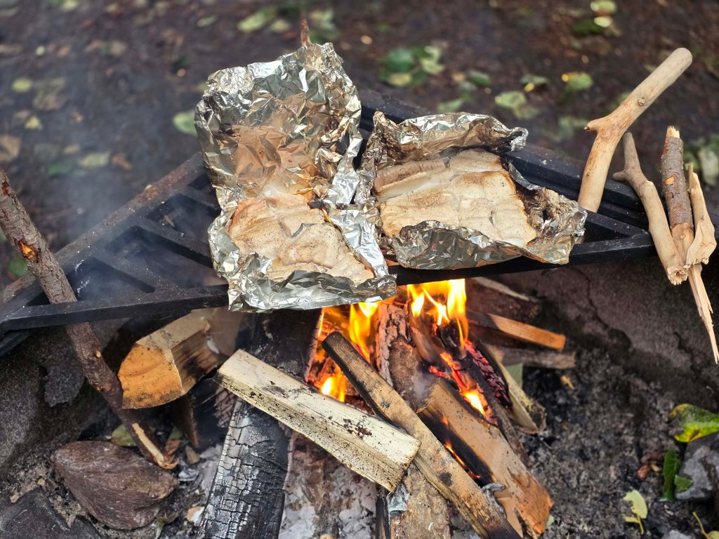 Kemping ma nowe drewniane stoły i metalowe grille. Rozpalamy ognisko z zebranego na kempingu mokrego drzewa wspomagając się 2 suchymi kłodami schowanymi na czarną godzinę w kamperze. Zawijamy rybę w folię i pieczemy na grillu……..