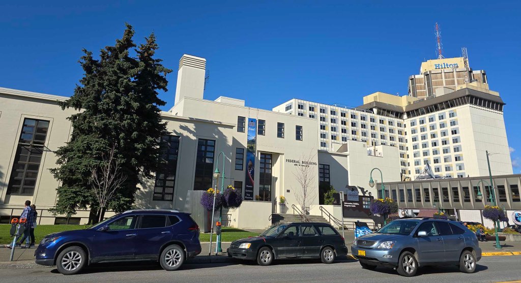 Szybka akcja organizacyjna z oddaniem kampera (sprzątanie, tankowanie, uzupełnianie propanu, pakowanie). Oddajemy walizki do przechowalni lotniskowej ($17 duża walizka i $14 mała na całą dobę). Kosztuje nas to 45$ plus nielimitowany przejazd autobusem 5$ cały dzień i mamy zorganizowany czas na ostatnie godziny przed wylotem. (wypożyczenie najtańszego auta na pół dnia -to koszt 190$). Jedziemy do centrum Anchorage. Wysiadamy na głównym dworcu w centrum Anchorage i spacerkiem idziemy do największego na Alasce centrum turystycznego – Anchorage Alaska Public Lands Information Center (605 West 4th Avenue Suite 105) obsługiwane przez strażników parków narodowych.