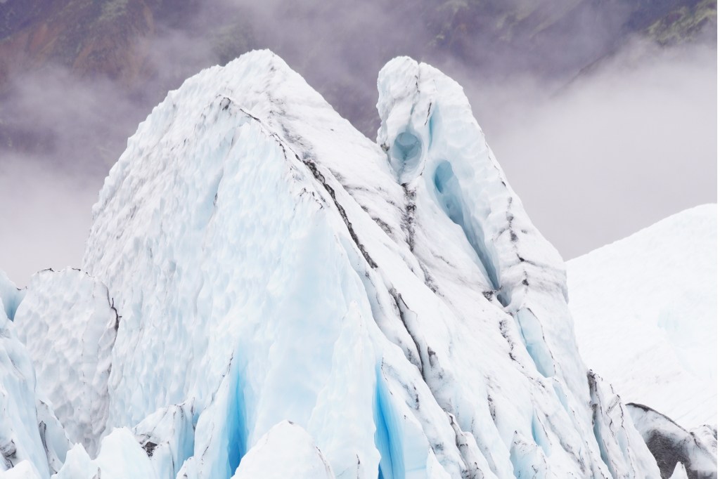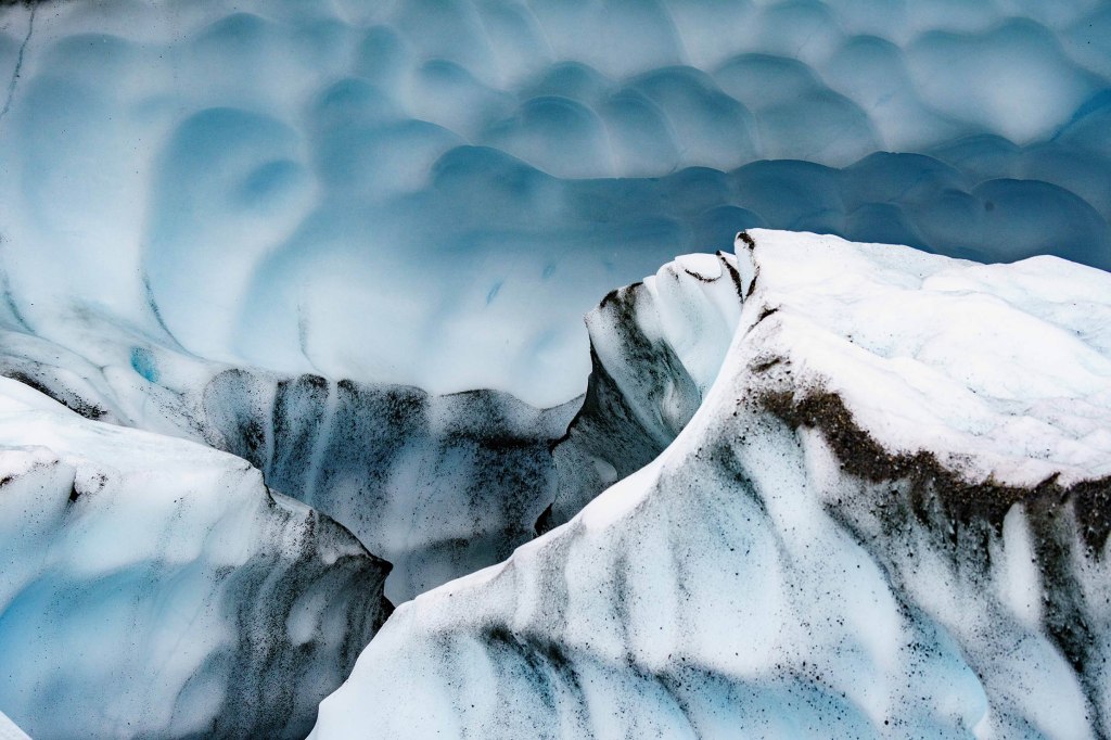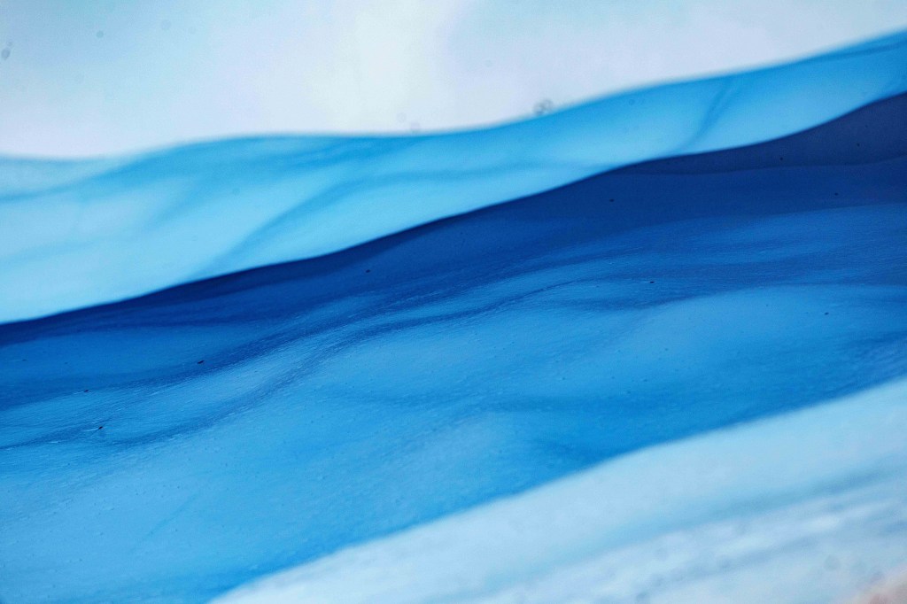 Lód na lodowcach wygląda na niebieski, ponieważ długie, czerwone fale są pochłaniane przez kryształki lodu, podczas gdy krótkie, niebieskie fale są transmitowane i rozpraszane.