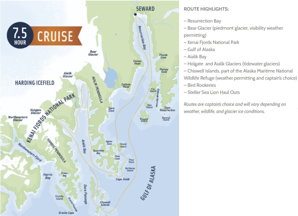 Wpływamy do Gulf of Alaska i skręcamy do zatoki Aialik Bay podpływając pod lodowiec Aialik Glacier następnie pod lodowiec Holgate, przepływamy pomiędzy wyspami Chiswell Islands, i wracamy przez Gulf of Alaska i Resuration bay do Seward.