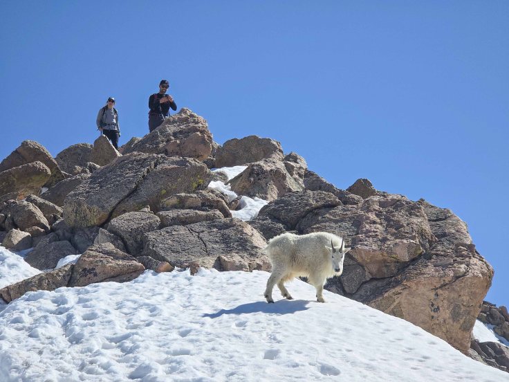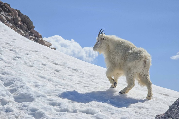 Im wyżej tym trudniej ze względu na stromość, niestabilność podłoża i zmniejszającą się ilość tlenu w powietrzu. Przed samym szczytem czeka bardzo strome podejście, gdzie raki i kijki wydają się jedyną opcją w jego pokonaniu… chyba że jest się kozłem górskim… Tuż przed de mną, dosłownie wyprzedzając mnie tanecznym krokiem przechodzi nagle śnieżnobiały kozioł.