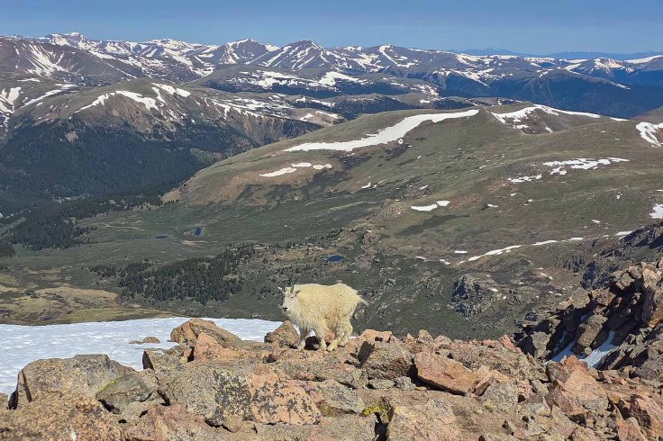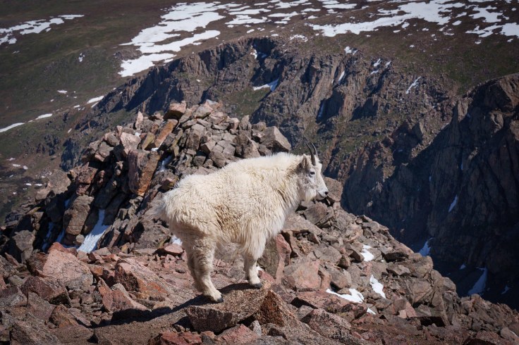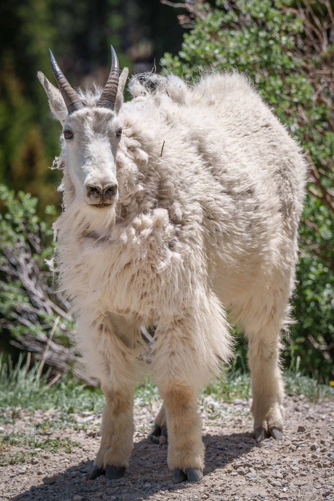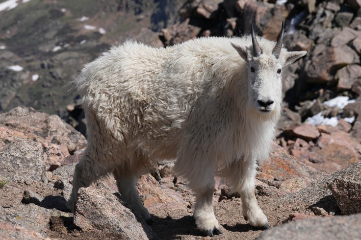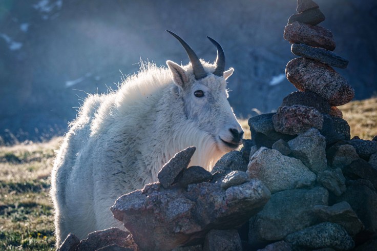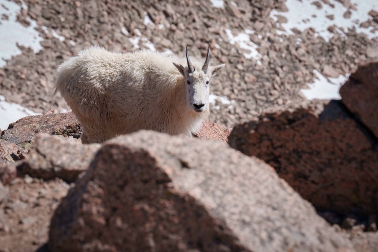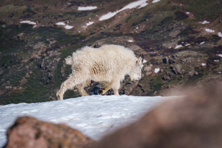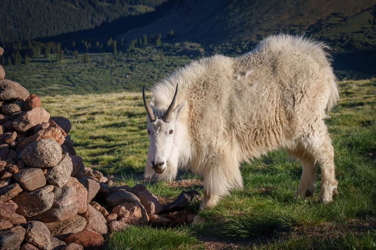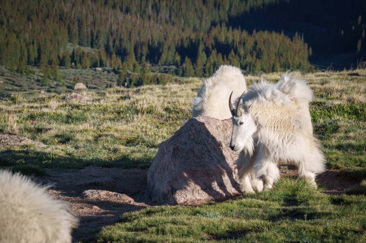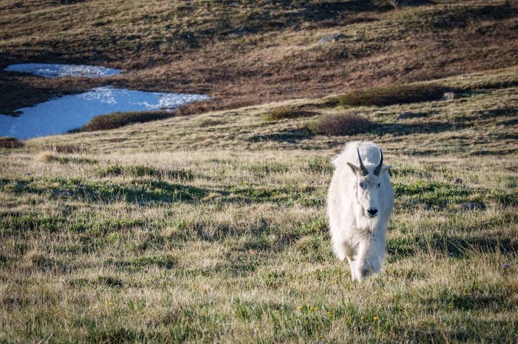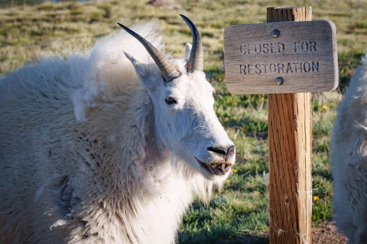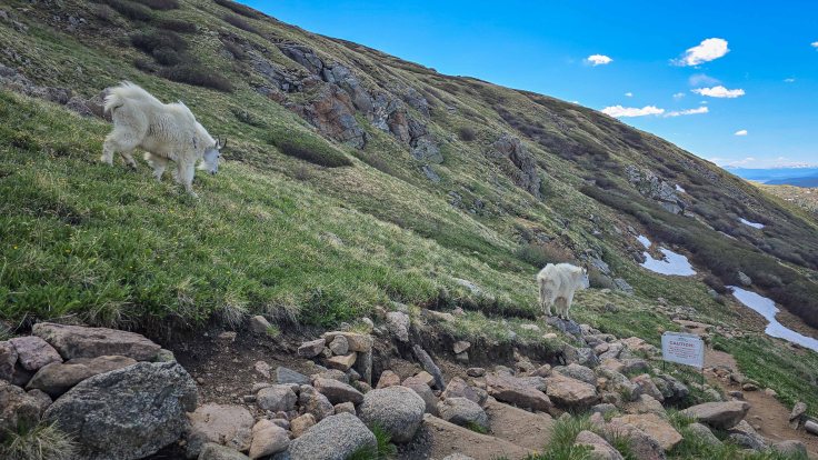 Trzeba przejść po głazach zanurzonych w wodzie, bardzo uważając by się nie pośliznąć i nie wpaść do lodowatej wody. Po przekroczeniu potoku szlak zaczyna się wznosić. Cały czas idę pomiędzy gęsto obsadzonymi bagiennymi krzewami i pomimo nieznacznego zwiększania wysokości mam już spore problemy z trzymaniem równomiernego oddechu…. Zaczynając z wysokości 3,557 m n.p.m. po zaledwie osiemnastu godzinach przebywania w Colorado mój organizm zdecydowanie jest jeszcze gotowy na takie szlaki jak dzisiejszy. W miarę wznoszenia się krzaczasta roślinność przerzedza się i zaczyna dominować tundra. Na zakręcie szlaku (około połowa drogi na szczyt), gdzie ustawione są wysokie kopczyki i drewniany płotek zagradzający dostęp do jakiejś starej nieużywanej ścieżki („closed for Restoration”) dostrzegam kilka kozłów górskich (mountain goats) nerwowo poszukujących słonych „pokładów” w okolicach tychże kopczyków.