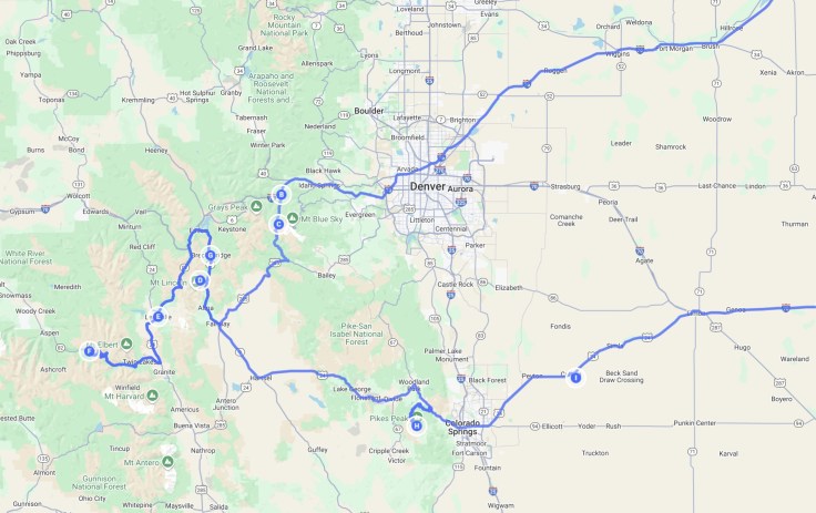 TRASA: Chicago – Colorado (Denver, Georgetown, Whiteriver National Forest: Guanella pass: South Park 600 to Square top lakes trail, Mt Bierstadt trail, Geneva mountain trail, Silver Dollar lake trail, Hoosier Pass loop trail, South Park Ghost town, Blue lakes fall trail, Blue lakes trail, Breckenridge, Saille Barber mine trail, Trollstigen Trail – Thomas Dumbo – Isak Hearthstone troll, Mt. Royal trail, Mayflower Gulch trail, Leadville, Pike San Isabel National Forest: Independence Pass, Lost man Reservoir trail; Pikes Peak, Painted Mines Interpretive Park) – Chicago