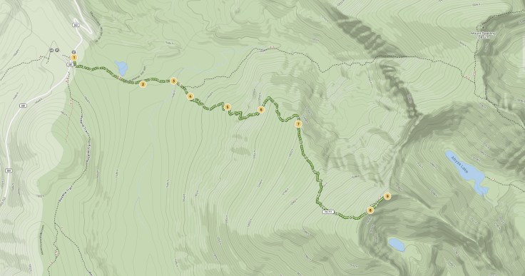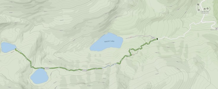 Po wyjściu na bardziej otwartą przestrzeń widzę pierwsze jezioro (Naylor lake), które mijam z góry… prywatna posiadłość z domkami letniskowymi. W górnej części szlaku znajduje się dużo gołoborzy i czasami ścieżka prowadzi centralnie przez te głazowiska. Pojawiają się też połacią śniegu, które bez większej trudności pokonuje w rakach.