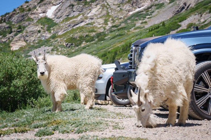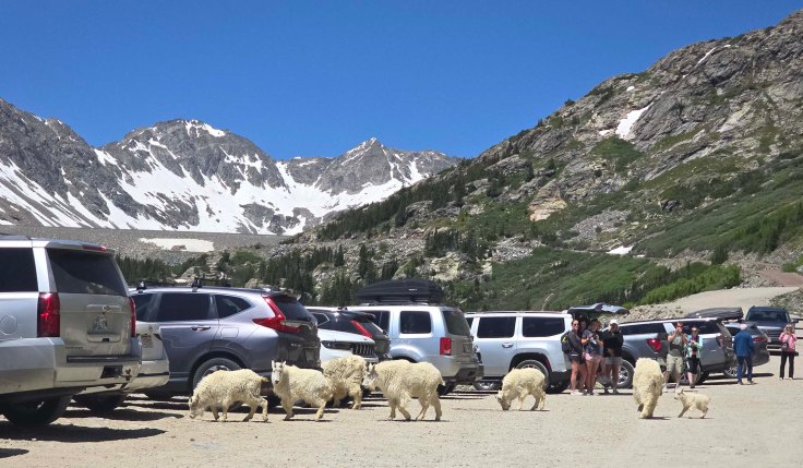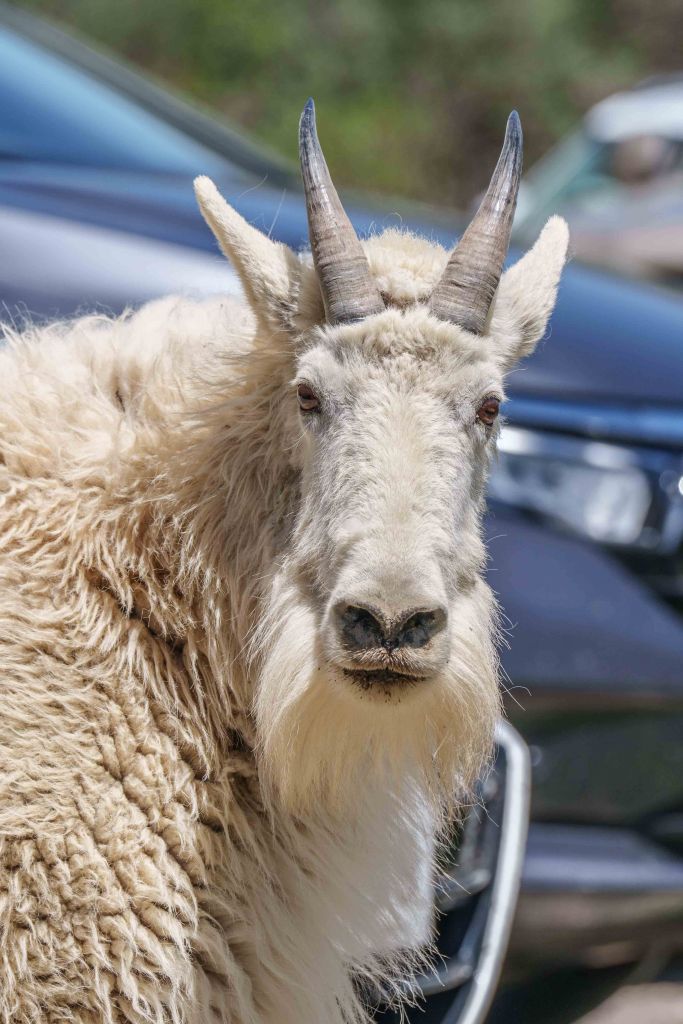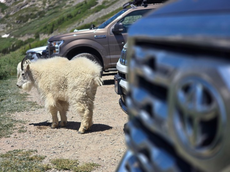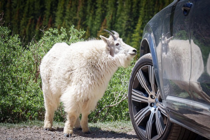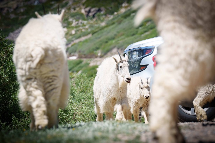 Na parkingu wypełnionym autami przechadzają się swobodnie kozły górskie, co chwila rozkopując ziemię w poszukiwaniu resztek soli drogowej.