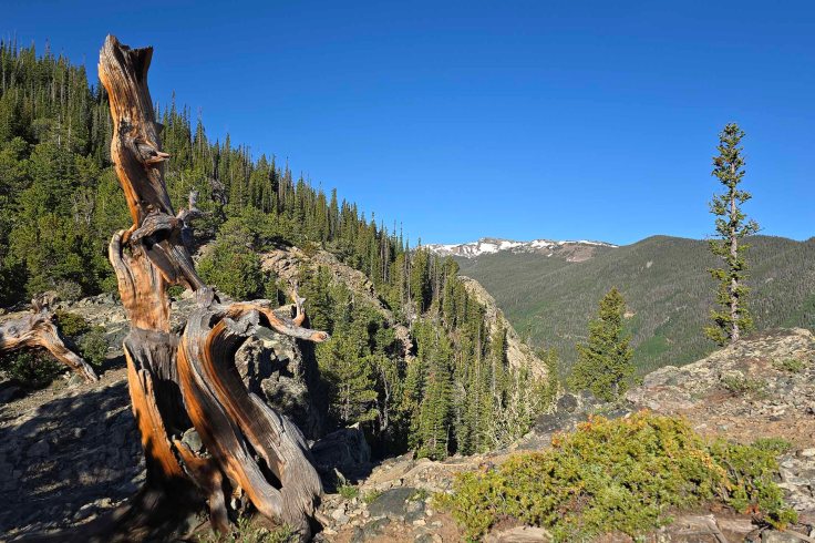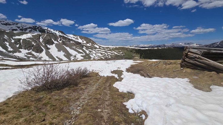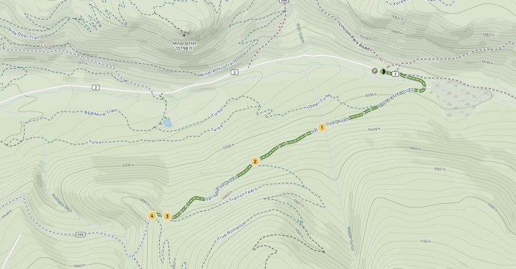 Wyjście na szlak na dwa parkingi – niższy przy głównej drodze Guanella Pass Road (#381) i wyższy, gdzie można dostać się autem o napędzie 4×4. Odcinek szutrowej drogi to 0.7 mili w jedną stronę, a więc do całkowitej długości szlaku należy dodać 1,4 mili wędrówki przy zaparkowaniu na głównym niższym parkingu. W chwili obecnej szlak pokrywa w wielu miejscach śnieg, więc do plecaka pakuje raki, stuptuty i zabieram również hikingowy kijek. Pierwsza część szlaku prowadzi po szutrowej stromo nachylonej leśnej drodze. Po dojściu do wyższego parkingu ścieżka staje się bardzo wąska i wchodzi się w gęsty las. Duża ilość korzeni i wystających kamieni spowalnia nieco wędrówkę.